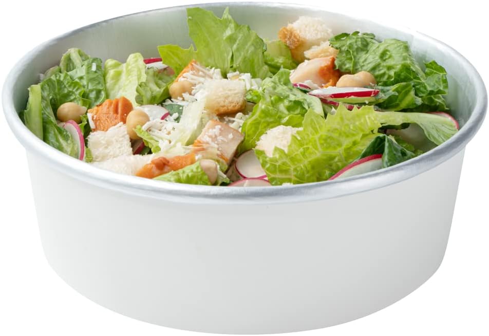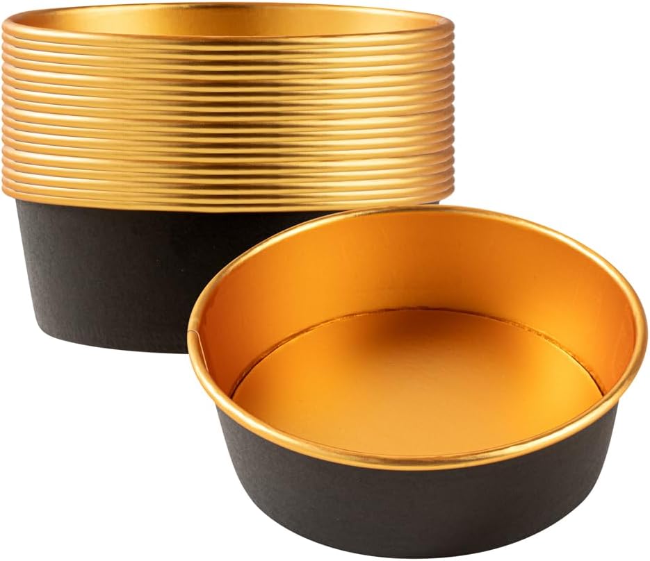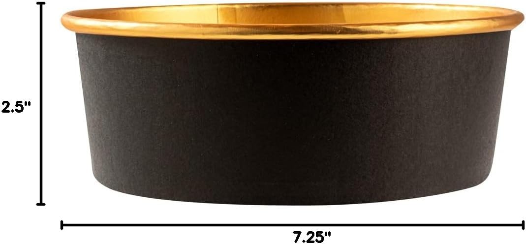 Enhance your takeaway orders with our Foil Lux 45-ounce Black And Gold paper Take Out Containers. These greaseproof take out containers feature an insulated interior foil lining that keeps your meals fresh and warm. Made from robust paper and aluminum foil, these food containers are ideal for both hot and cold food items. These to go containers pair perfectly with our Foil Lux lids (SKU: RWM0155C) for secured on-the-go orders. The black finish of these takeaway containers adds a stylish touch to your customers' orders. For efficient food packaging, these black food containers can be easily stacked. These paper take out containers measure 7.3 inches in diameter by 2.6 inches in height, and have a capacity of 45 ounces. Sold in a 200 count box. Compatible Foil Lux lids are available and sold separately.