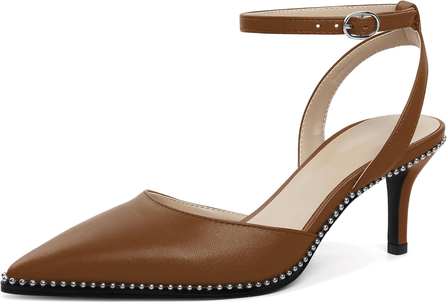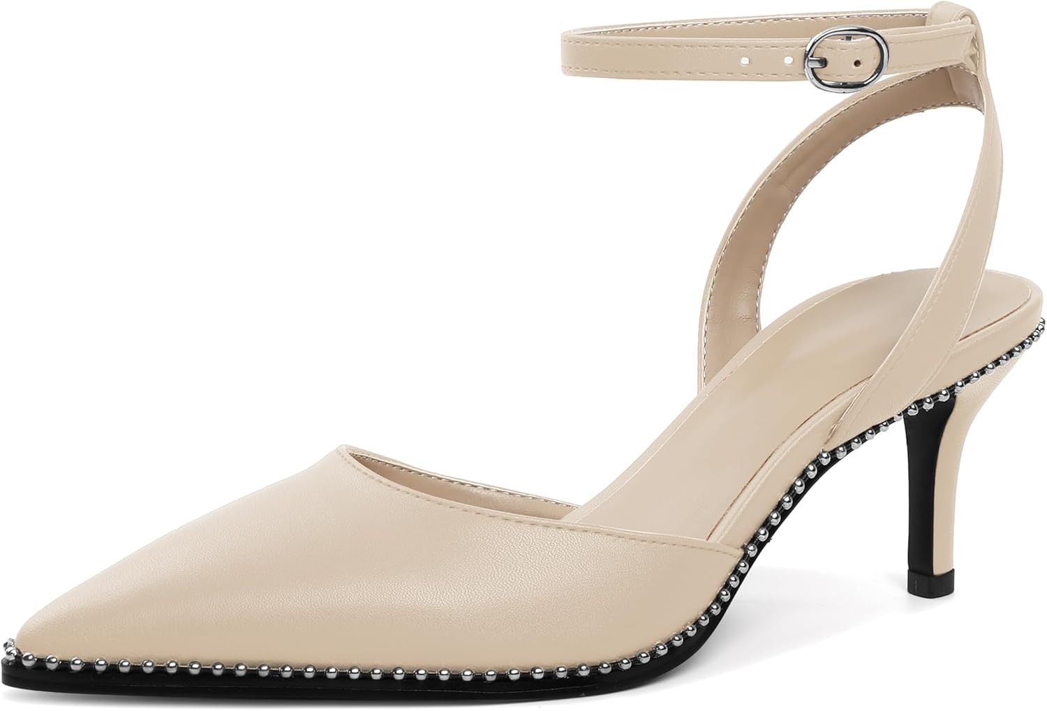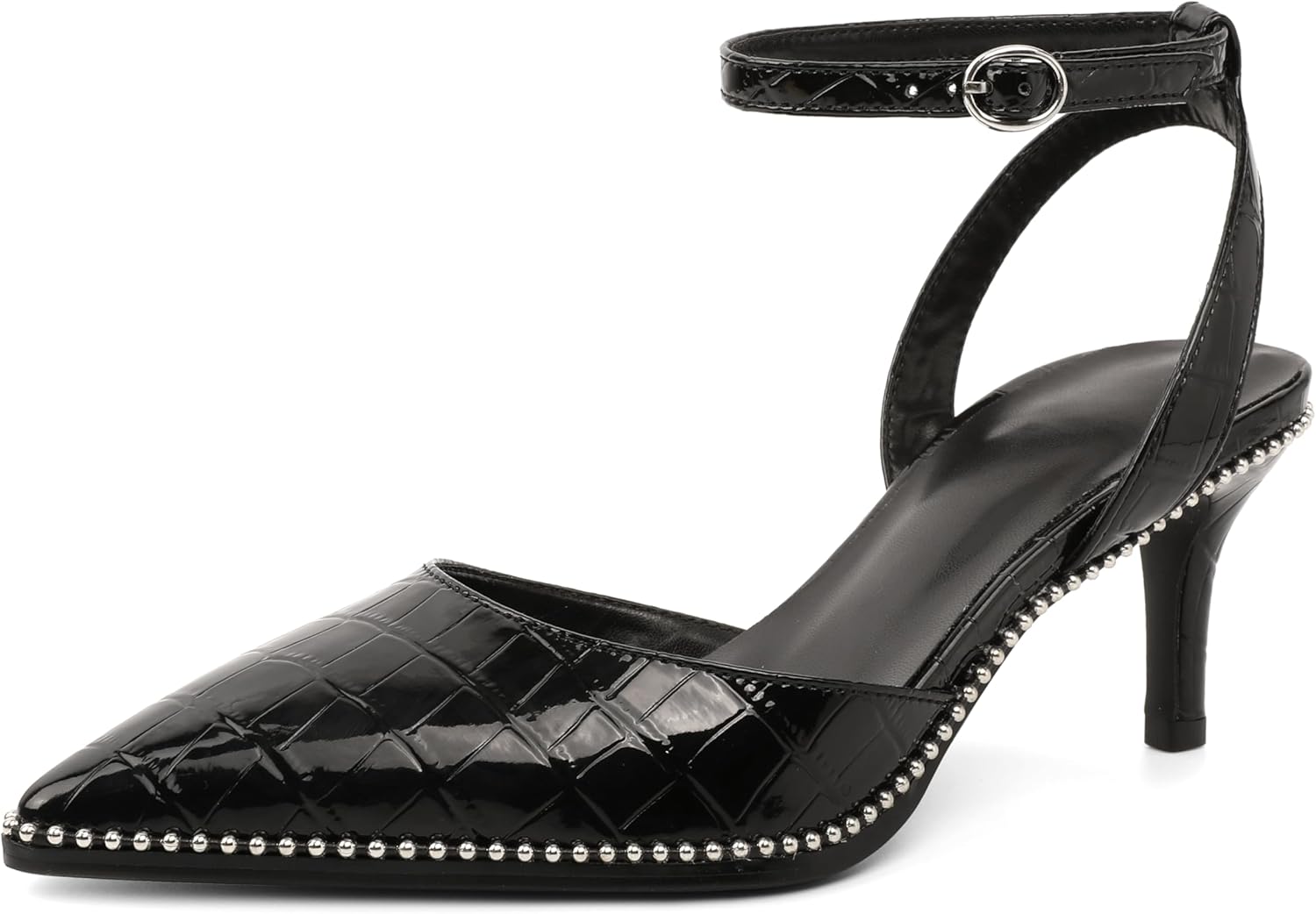SAMMITOP Women's Kitten Heel Slingback Pointed Closed Toe Pumps Ankle Strap Dress Shoes Beaded Low Stiletto Heels Shoes for Lady Comfy Dressy 2.5 Inch Set on a kitten heel, this simple low slingback heeled sandals has built in comfort features that include a soft insole, skin-friendly lining and non-slip soles, you can wear it day to night. These ladylike dressy slingback heels will make you shine among the crowd. Update your personal ensemble with beautiful colors on this essential Pumps! Perfect for wearing with casual style dress, shorts, jeans, pants, etc.